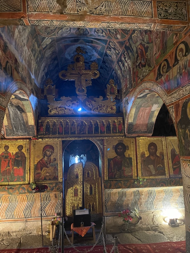 Факт, който ме удиви беше, че 400 годишния иконостас и стенописите не са реставрирани, а само са почистени от саждите между 1973 и 1978 година от реставратора Петър Попов и архитекта Златка Кирова. На едно малко квадратче е оставено да се види как е изглеждала стената преди саждите да са премахнати.