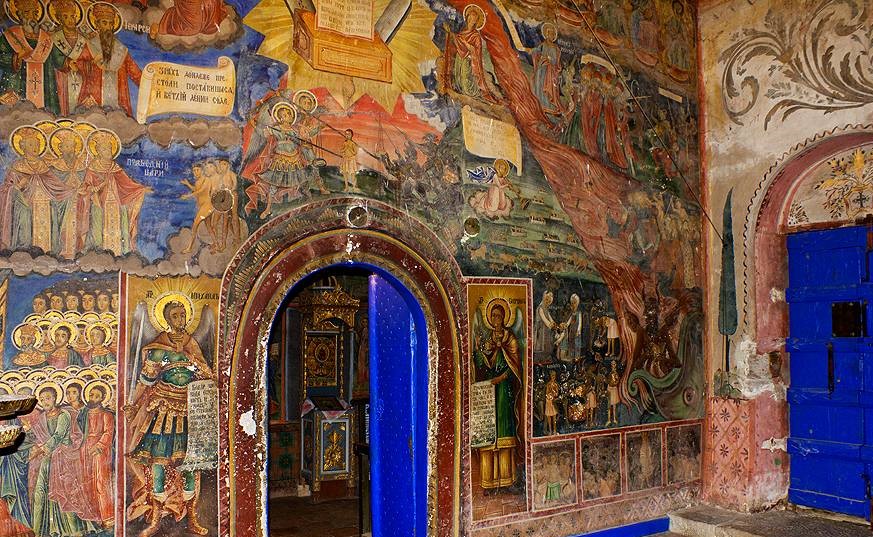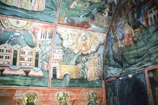 Стенописът “Колелото на живота”, чийто автор е Захари Зограф от външната страна на църквата беше това което предизвика миг на размисъл в нас. Простоватата на пръв поглед трактовка на житейския цикъл ни извади от суетата на ежедневието и за миг се пренесохме на сцената на живота. Чрез нарисуваното колело майсторът се е постарал да покаже както светската страна на живота, съпътствана от власт и пари, така и духовната. Чрез образите на Пролетта, Лятото, Есента и Зимата е предаден живота на човека от неговото раждане. Съответно неговото детство, съзряване, утвърждаване като личност и годините, в които се наслаждава на всичко сторено в живота. Колелото е изобразено чрез два кръга-два различни начини по които човек може да прекара живота си. Във външния кръг са изографисани нещата които, всеки иска да постигне бързо и лесно: кесия( символ на парите) и скиптър ( символ на властта). И общо взето, до към 35 години това нещо може да се постигне след което кесията и скиптърът изчезват, любовта също я няма и лека по-лека човек пропада. Накрая го изяжда една ламя. Така става ако се отдаде само на парите човек.