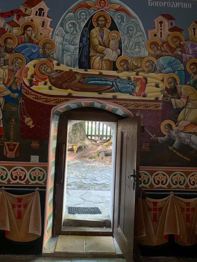 Наскоро е направен ремонт на манастира, стенописите изглеждаха като току-що изографисани на стената над ниската порта.
