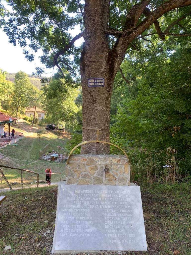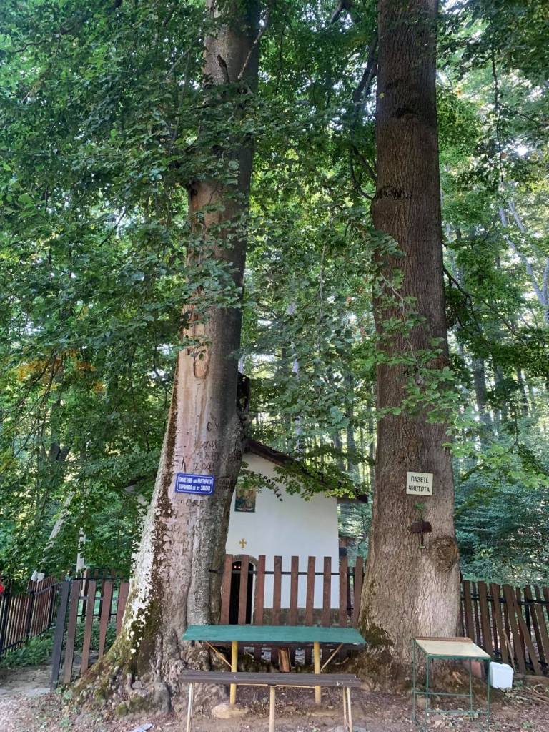 Пред манастира, като горди пазачи се издигат две величествени дървета, наподобаващи на великански хранители на светата обител. Двете дървета пред храма са ясен и бук. Корените им са вплетени в прегръдка, точно както и клоните им. За тях разбрах, че има в традициите на легендите, красива история, която се предава и до днес от поколение на поколение,